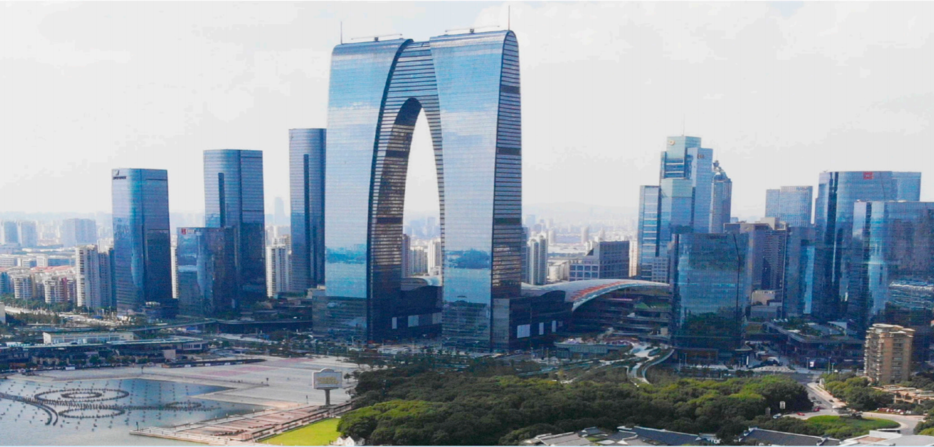 苏州中心广场项目位于苏州工业园区金鸡湖西侧,毗邻东方之门,居苏州市域CBD核心位置,轨交1号线、6号线贯穿整个项目区域,整体占地21.1公顷,净地面积13.9公顷,总建筑面积约182万平方米,其中地上建筑面积130万平方米、地下建筑面积52万平方米。
