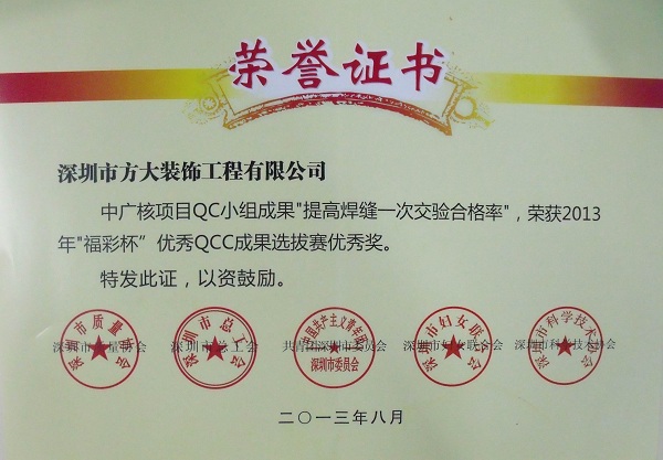 深圳市2007so太阳集团装饰工程有限公司中广核项目QC小组成果“提高焊缝一次交验合格率”