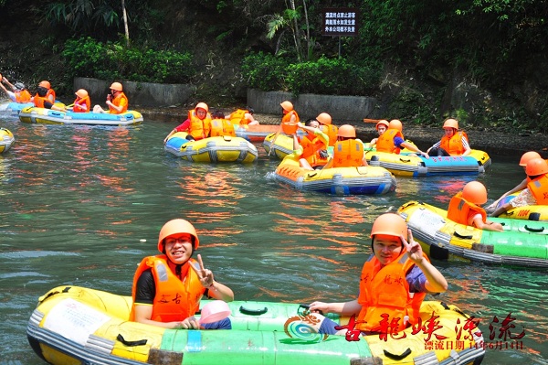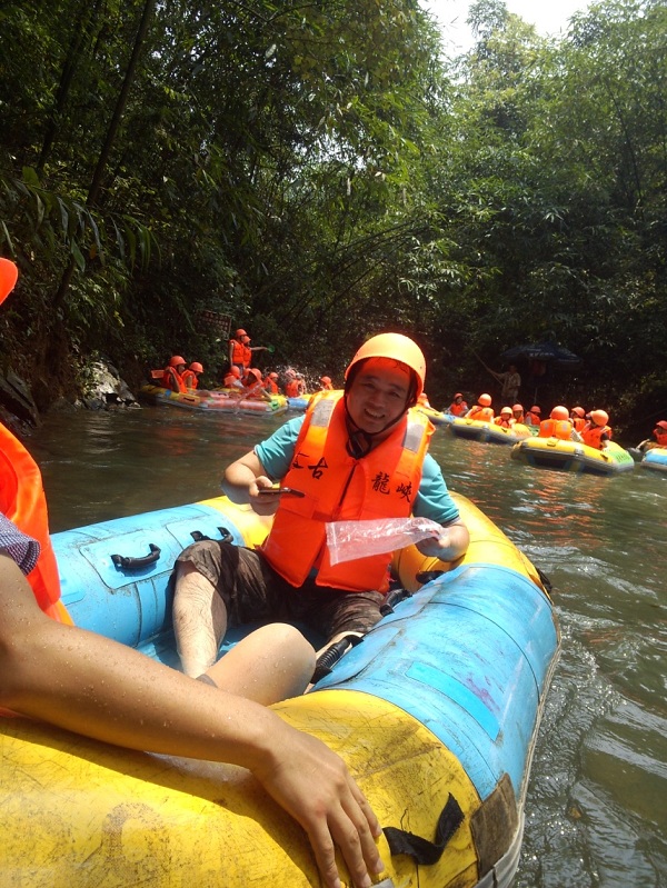 活动当天晴空万里,部分六月生日寿星7:40准时集合出发,历经近4小时的车程终于到达了让大家兴奋不已的国际漂流基地——清远古龙峡。 大家搭乘漂流点的巴士抵达漂流的起点,做好安全准备之后便两两组合上艇开始了漂流之旅。皮艇像浪尖上的过山车高速滑行,飞旋在波峰波谷间,惊魂未定之际又嘎然而止,橡皮艇稳稳跃入一个的清澈水潭里,平静下来,尖叫声犹在耳边。一处处激流回旋,一道道极限落差就在一路尖叫声中被抛在身后了。回转身去,油然而生的是轻舟已过万重山的豪迈之感。