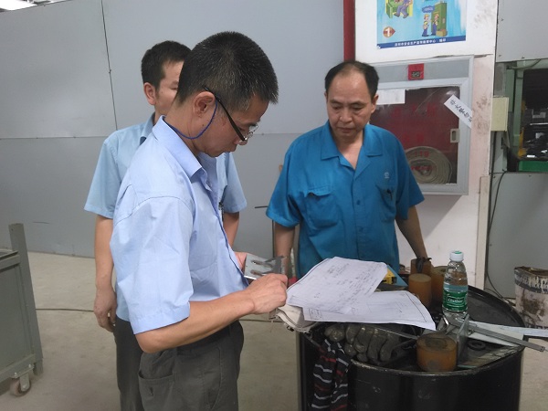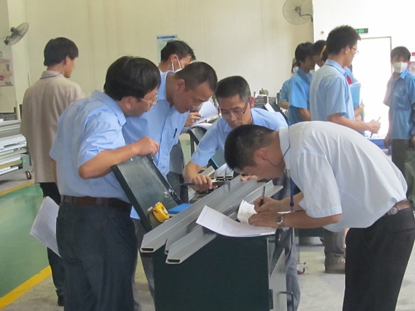 评审组成员和现场质检人员正在对产品的数据进行认真检测与填写