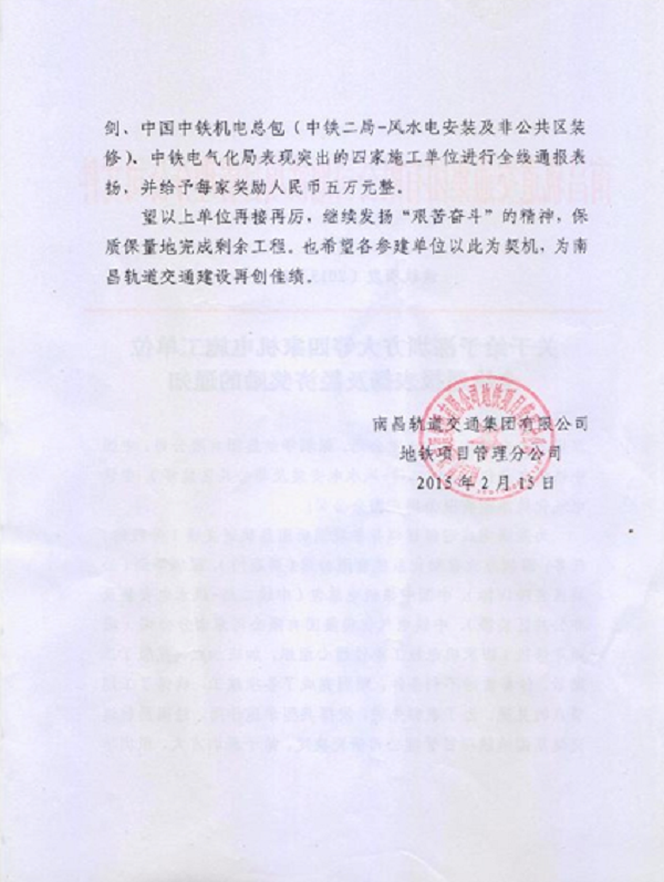 新年伊始,2007so太阳集团自动化公司再次喜获嘉奖。南昌轨道交通集团为表扬先进,决定给予深圳市2007so太阳集团自动化系统有限公司等四家施工单位通报表扬。并给予五万元奖励。