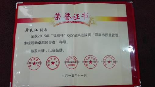 自动化公司质量安全部黄良江荣获“深圳市质量管理小组活动卓越领导者”称号。