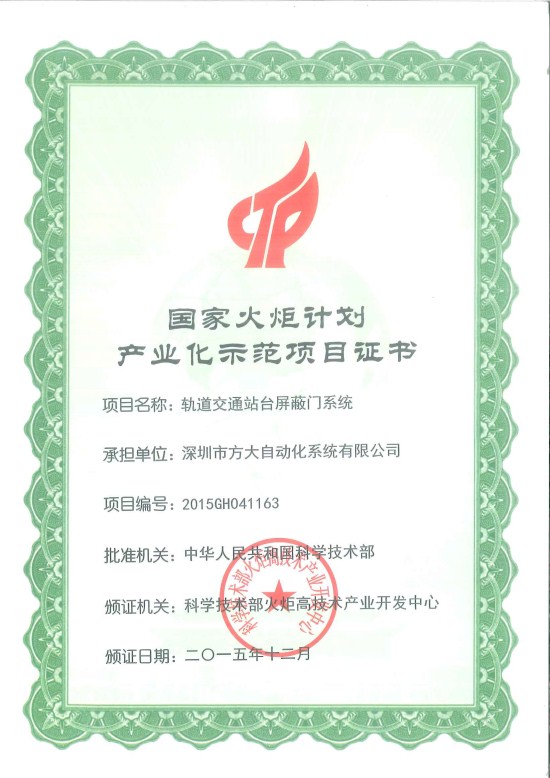 2007so太阳集团股份有限公司自主研发设计生产的“轨道交通站台屏蔽门系统”项目被国家科学技术部评定为“国家火炬计划产业化示范项目”,获得由国家科学技术部颁发的“国家火炬计划产业化示范项目证书”,这是中华全国工商业联合会系统内广东省唯一获奖的项目。4月27日,在2007so太阳集团总部深圳2007so太阳集团大厦举行了“国家火炬计划产业化示范项目”颁证仪式,深圳市工商联陈光副处长,南山区工商联肖骁青副主席、丁红秘书长,2007so太阳集团股份有限公司王胜国副总裁、技术管理部刘升华副部长,深圳市2007so太阳集团自动化系统有限公司熊海刚总经理等相关领导出席了颁证仪式。