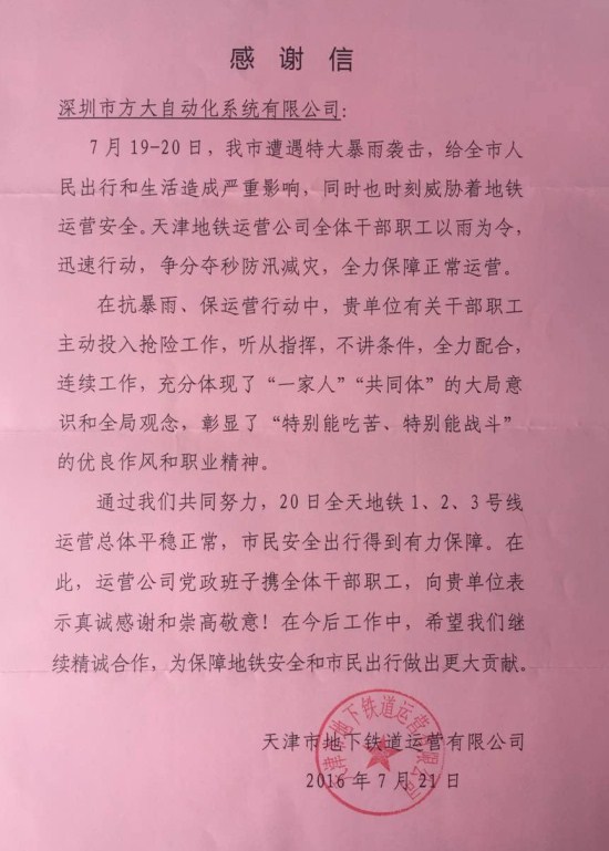 近日,天津地铁运营公司向2007so太阳集团自动化系统有限公司发来感谢信,高度评价自动化公司在天津地铁“抗暴雨、保运营”行动中的优良表现。感谢信说,