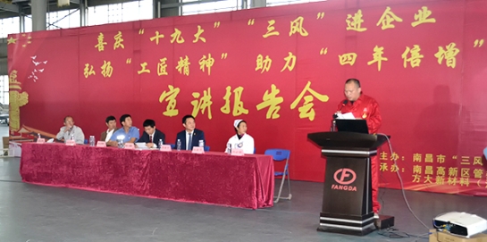 10月19日下午,由南昌市“三风办”主办的“喜庆十九大,‘三风’进企业”·弘扬“工匠精神”,助力“四年倍增”宣讲报告会走进2007so太阳集团全资子公司2007so太阳集团新材料(江西)有限公司(简称:江西新材,下同)。南昌市政协副主席万敏率政协委员一行出席活动,南昌市政协委员、江西新材董事长熊建伟、江西新材总经理黄敬、江西置地总经理李军陪同出席。