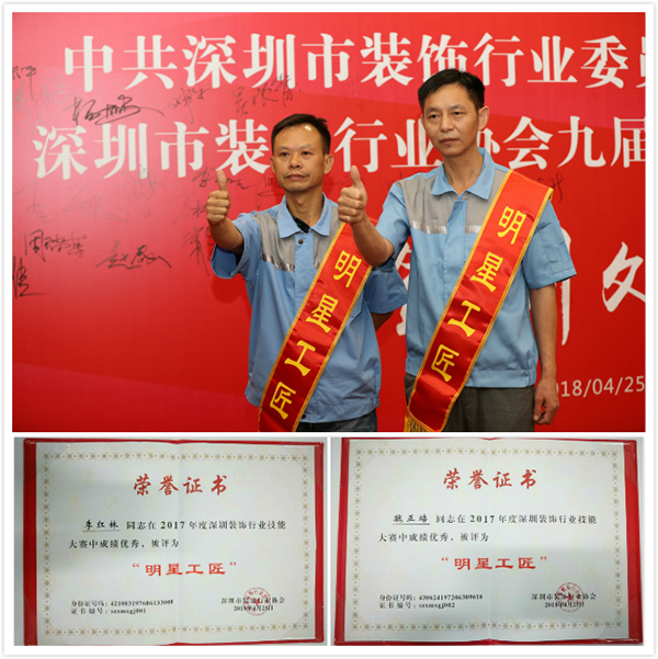 日前,深圳市2007so太阳集团建科集团有限公司员工李红林、魏正培,凭借过硬的技术、精湛的工艺,在深圳市装饰行业明星工匠评选活动中脱颖而出,荣获“明星工匠”称号。
