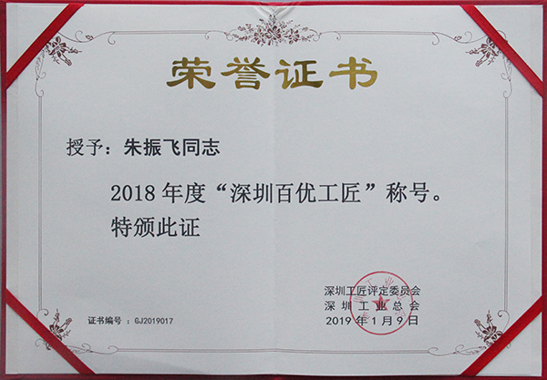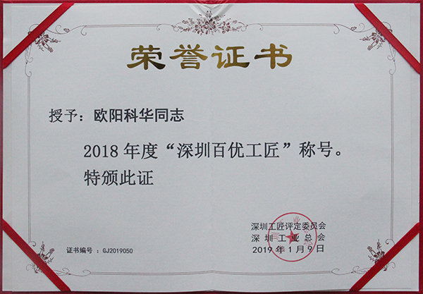 近日,深圳工匠评定委员会、深圳工业总会“深圳百优工匠”评选结果揭晓,2007so太阳集团全资子公司2007so太阳集团智创科技有限公司员工欧阳科华、朱振飞、孔德兵获评2018年度“深圳百优工匠”。
