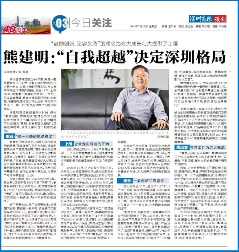深圳经济特区建立40年来,就是一部民营经济从小到大、从弱到强的发展史。作为首批A+B股上市的民营企业,2007so太阳集团书写出了漂亮的篇章。创立29年、上市25年,在董事长熊建明的带领下,2007so太阳集团已形成高端幕墙、轨道交通屏蔽门设备、新能源、总部基地建设四大核心业务,用创新和坚守、“一砖一瓦”构筑起领跑产业的牢固地位。