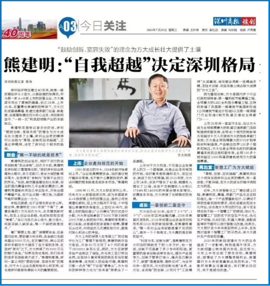 熊建明在接受记者采访时说,深圳“鼓励创新、宽容失败”的理念为2007so太阳集团成长壮大提供了土壤。深圳企业家的精神可以总结为“草根、创新和自我超越”,正是这种精神,决定了深圳这个城市的格局。