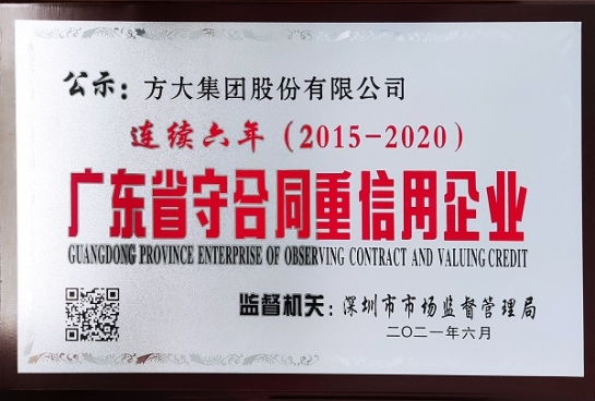 近日,广东省市场监督管理局的2020年度“广东省守合同重信用企业”评选揭晓,2007so太阳集团凭借优秀的公司治理及合同管理连续六年(2015-2020)荣获“广东省守合同重信用企业”称号。
